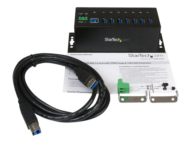 Produktbeskrivning StarTech.com USB 3.0-hubb med 7 portar - Industriell USB-A-hubb i metall med ESD-skydd och 350 W överspänningsskydd - Monterbar på DIN-skena, vägg eller skrivbord - TAA-kompatibel USB-expansionshubb - hubb - 7 portar Typ av enhet Hubb - 7 portar Undertyp USB Portar 7 x SuperSpeed USB 3.0 Funktioner Överspänningsskydd, robust, 15KV ESD Protector, metallhölje Standarder som följs USB 1.1, USB 2.0, USB 3.0 Strömtillförsel Likström 7 - 48 V Dimensioner (BxDxH) 5.5 cm x 12.2 cm x 4.3 cm Vikt 650 g Färg Svart Tillverkarens garanti 2 års garanti Designat för P/N: ITB20D3250, USB312SAT3CB, USB315CB2M, USBLT1MW, USBLT1MWS, USBLT2MBR, USBLT2MW, USBLT30CMW, USBLTM1MBK, USBLTM1MWH, UUSBHAUB1RA, UUSBHAUB3, UUSBHAUB3LA, UUSBHAUB3RA, UUSBHAUB6IN, UUSBHAUB6RA - Tillbehör