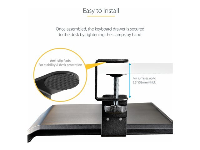 Produktbeskrivning StarTech.com Under-Desk Keyboard Tray, Clamp-on Keyboard Holder, Supports up to 12kg (26.5lb), Sliding Keyboard and Mouse Drawer with C-Clamps, Height Adjustable Keyboard Tray - Black - Ergonomic Keyboard Tray (KEYBOARD-TRAY-CLAMP1) - tangentbordsfack Produkttyp Tangentbordsfack Förpackningens innehåll 5 skruvar för höjdjustering, 5 monteringsskruvar för fack, 2 vänsterfästen, 2 skrivbordsklämmor, snabbstartsguide Placering/montering Kan monteras under bord Produktmaterial Plast, stål Dimensioner (BxDxH) 31 cm x 70 cm x 3.2 cm Färg Svart Tillverkarens garanti 2 års garanti - Tillbehör