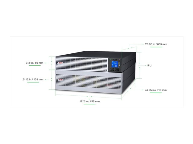 Produktbeskrivning APC Easy UPS On-Line - UPS - utökat driftid, hårdvarukontakt (1P+N+E), intelligent kortplats, med skenmonteringskit - 6 kW - 6000 VA - Li-Ion Typ av enhet UPS - rackmonterbar/extern Stativstorlek 5U Vikt 69.2 kg Inspänning AC 230 V Utspänning AC 230 V Effektkapacitet 6 kW / 6000 VA Inmatningsanslutningar 1 x fast 3 ledningar (1P + N + E) Batteri Litiumjon litiumjon Driftstid (upp till) 35 min på full laddning Nätverk RS-232, USB, RJ-11, RJ-45 Inkluderade tillbehör Stabiliseringstassar Färg Svart, silver (framskydd) Dimensioner (BxDxH) 43.8 cm x 68.5 cm x 21.7 cm Tillverkarens garanti 3 års garanti Designat för P/N: AP9544, SRVSMB001, VGL9901I - Tillbehör